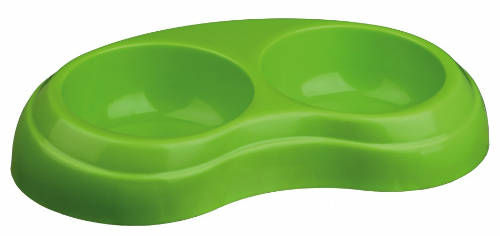 Dupla etetőtál egyben. Nehezített, csúszásgátló gumitalpakkal ellátva. A gumitalpak eltávolítása után mosogatógépben is mosható. Több színben.