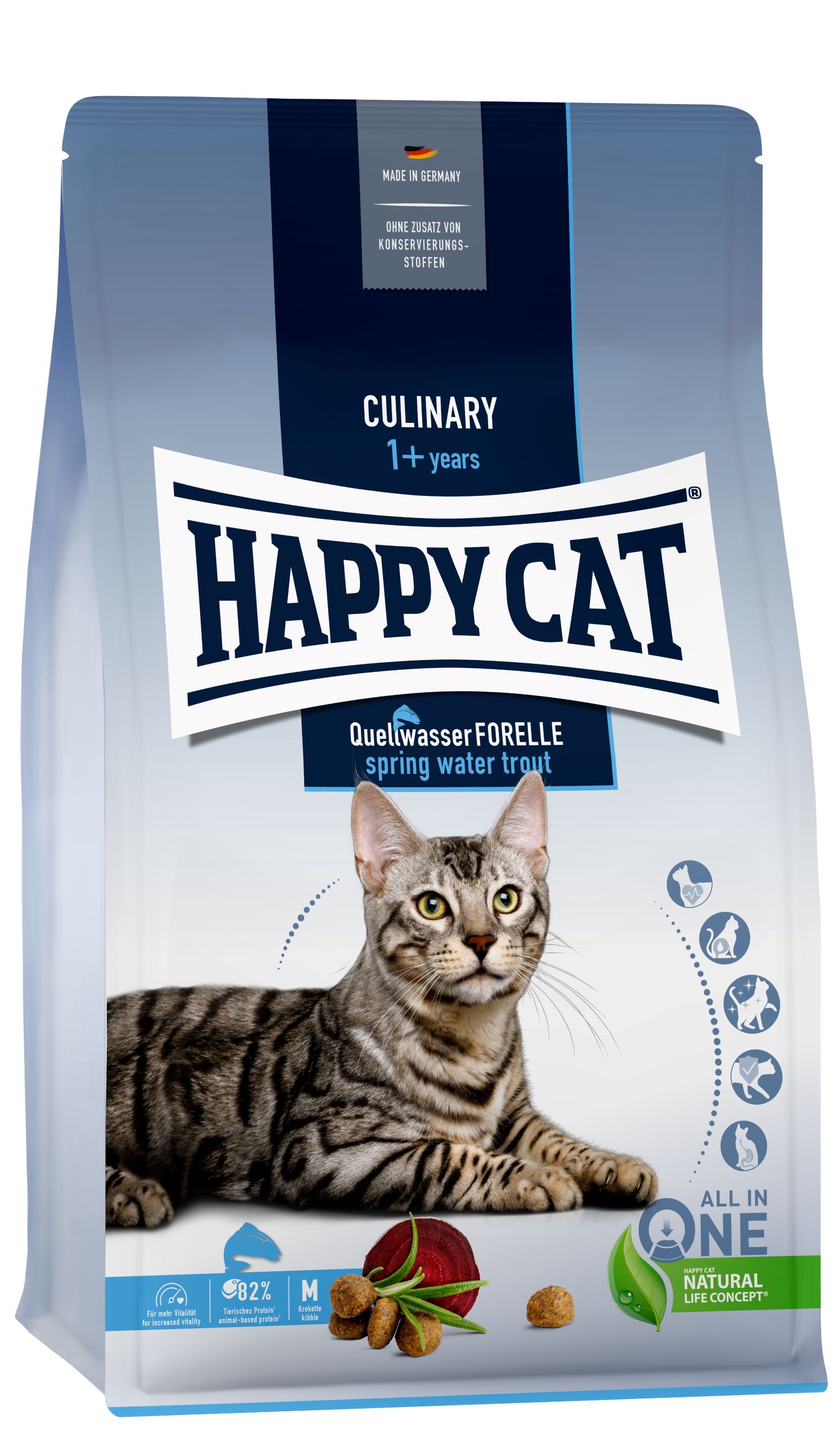 HAPPY CAT ADULT Culinary állateledel pisztránggal felnőtt macskák részére, a fényes szőrzetért és vitalitásért További részletek...