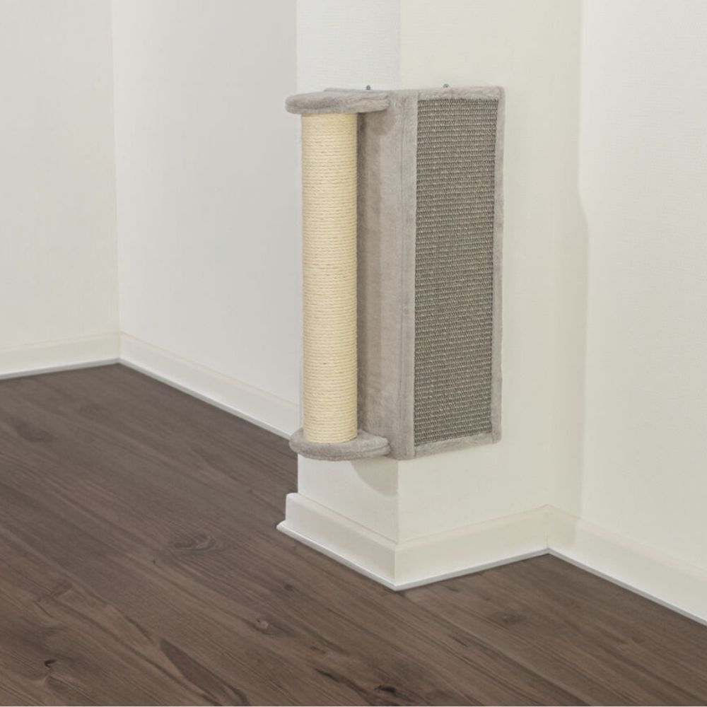 A TRIXIE Scratching Board for Corners with Post (43082) egy sarokba helyezhető, falra szerelhető kaparófa macskák részére, amely hatékonyan segíti a karmok koptatását és ápolását. A kaparó 6 mm vastagságú szizál borítással rendelkezik, amely tartós, természetes kaparófelületet biztosít a mindennapi használathoz.